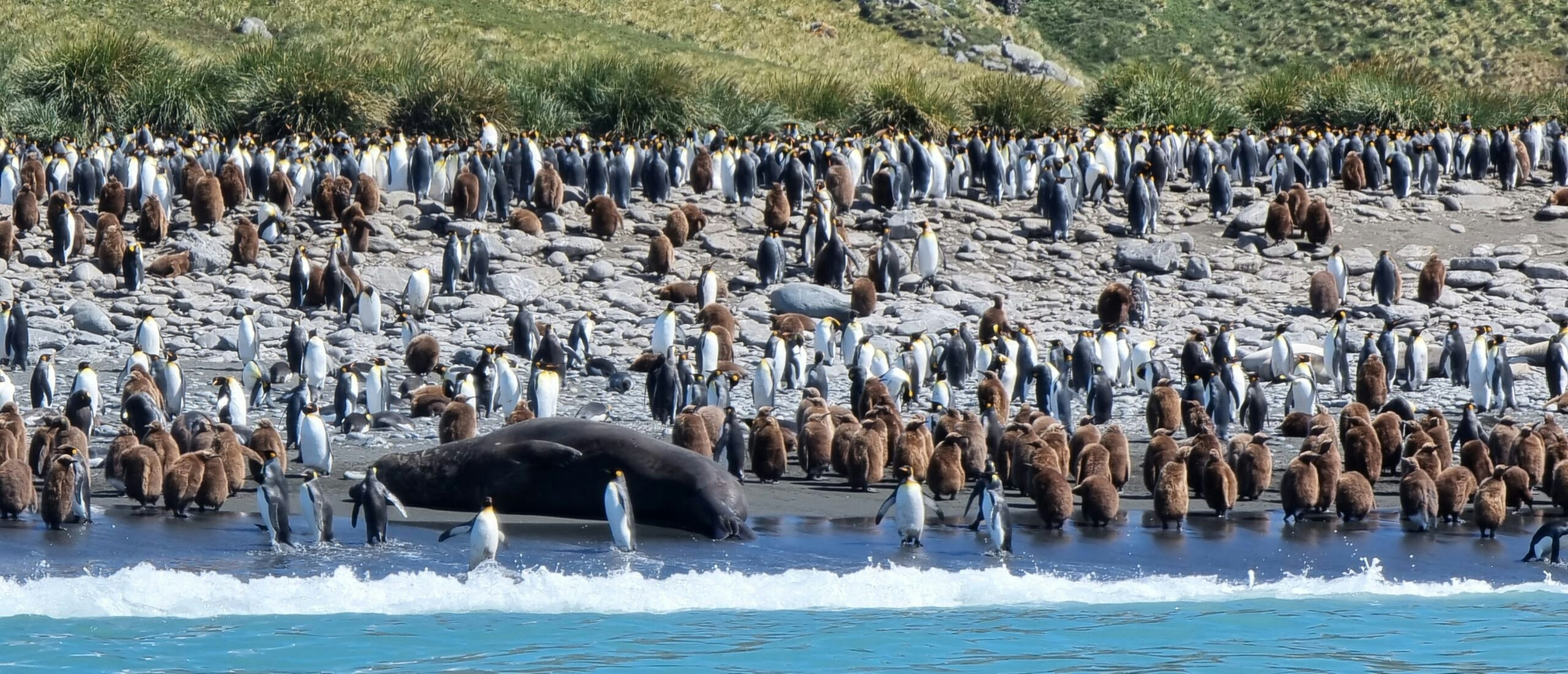 Những con chim cánh cụt vua đi bộ trên bãi biển Gold Harbor của đảo Nam Georgia, với sư tử biển và hải cẩu voi phía nam ở phía sau. (Bruno Giussani for Noema Magazine)